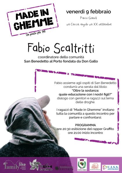 Giovedì 9 febbraio ore 21.00 presso il Centro di aggregazione giovanile "Made in Ghemme", Fabio Scaltritti, coordinatore della comunità San Benedetto al Porto fondata da Don Gallo, insieme agli ospiti di San Benedetto condurrà una serata dal titolo "Oltre la sostanza: quale educazione con i nostri figli?" dialogo con genitori e ragazzi sul tema delle droghe.