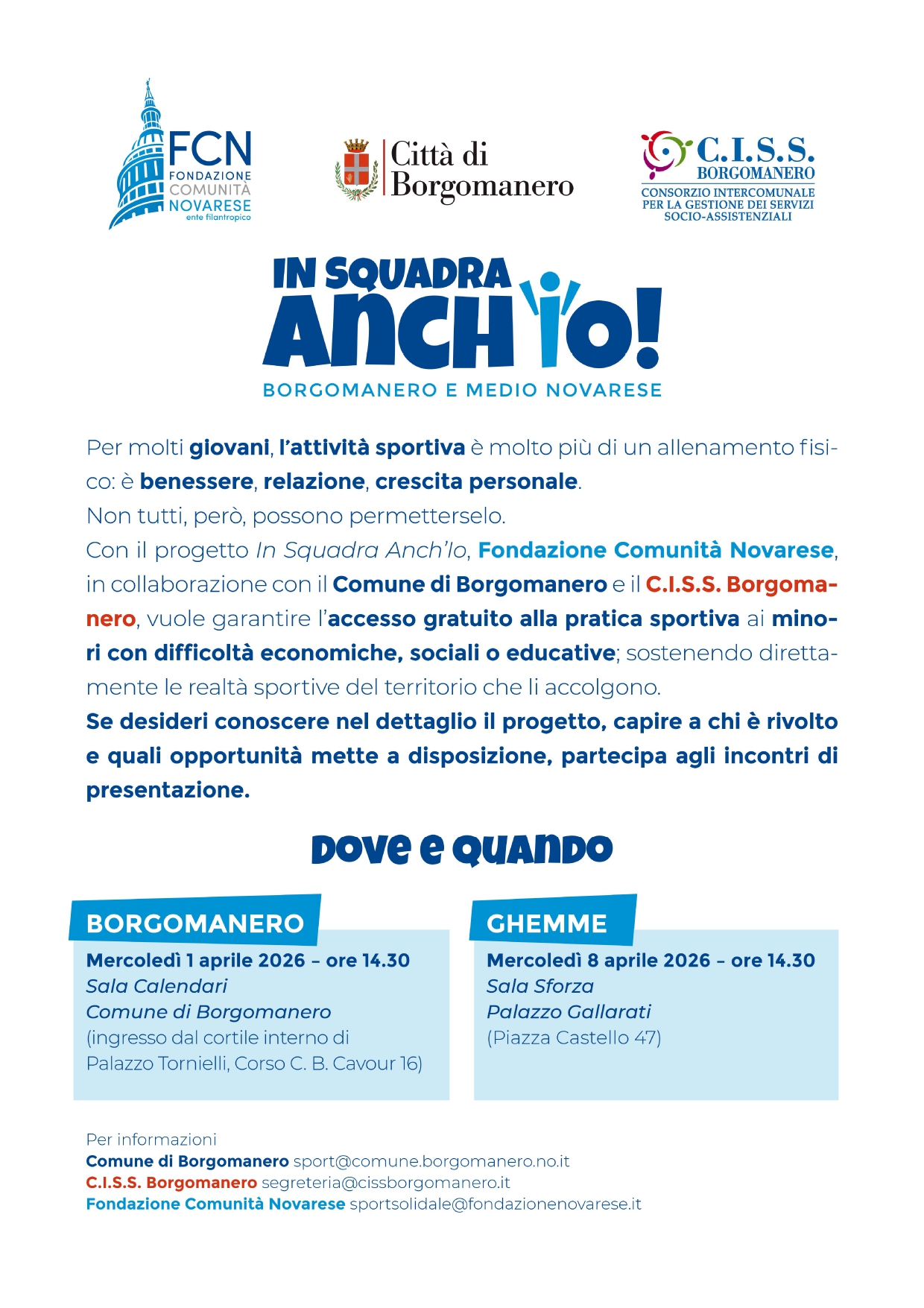 Il progetto "In Squadra Anch'Io", promosso dalla Fondazione Comunità Novarese, a cui partecipa il Consorzio Intercomunale per la gestione dei Servizi Socio-assistenziali (C.I.S.S.) di Borgomanero in collaborazione con il Comune di Borgomanero, ha lo scopo di incentivare lo sport nei minori con famiglie in difficoltà economiche, permettendo così ai medesimi di partecipare alle attività che le Associazioni del territorio dei Comuni consorziati offrono.