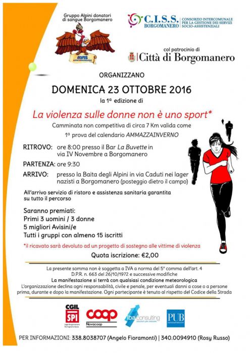 L'iniziativa, promossa dal CISS di Borgomanero e il Gruppo Alpini donatori di sangue, con il patrocinio del Comune di Borgomanero, ha la finalità di accrescere la sensibilità sul tema della violenza di genere.