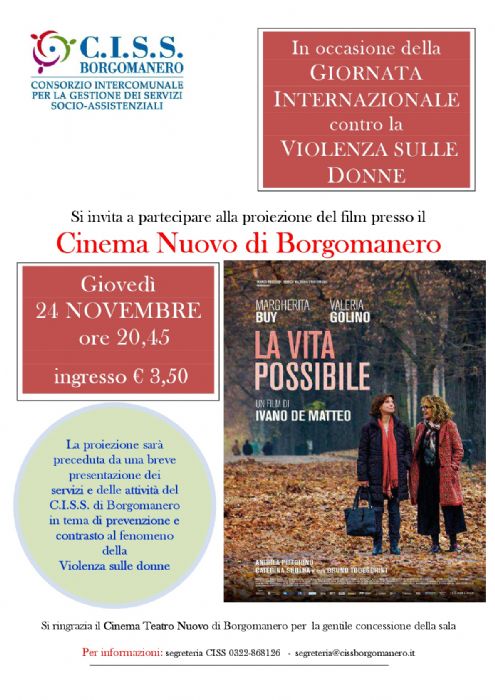 In occasione della Giornata Internazionale contro la Violenza sulle Donne, il CISS organizza per giovedì 24.11.2016 ore 20.45 presso il Cinema Nuovo a Borgomanero la proiezione del film "La Vita possibile" di Ivano De Matteo con Margherita Buy e Valeria Golino. Ingresso € 3,50