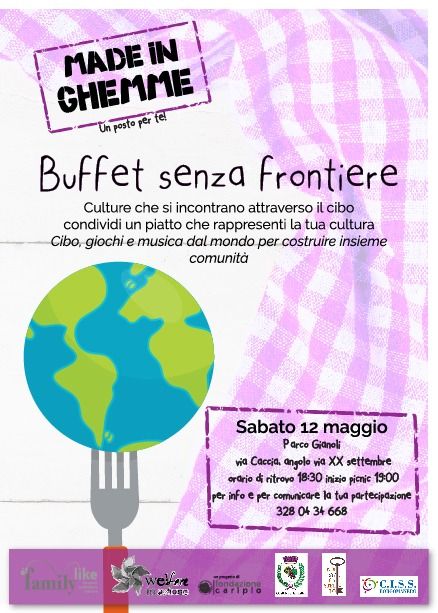 Sabato 12 maggio presso il Centro di aggregazione Made in Ghemme, all'interno del Parco Gianoli, si terrà l'evento "Buffet senza frontiere - Culture che si incontrano attraverso il cibo" con giochi e musica da tutto il mondo.
