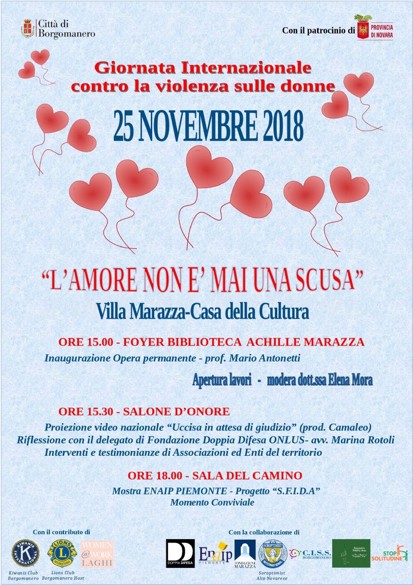 Siamo lieti di invitarvi all'evento, che si terrà il giorno 25 novembre 2018 in occasione della Giornata Internazionale contro la violenza sulle donne in Villa Marazza a Borgomanero, dal titolo "L'Amore non è mai una scusa".