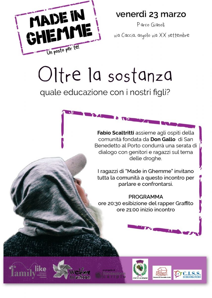 Venerdì 23 marzo ore 21.00 presso il Centro di aggregazione giovanile "Made in Ghemme", Fabio Scaltritti, coordinatore della comunità San Benedetto al Porto fondata da Don Gallo, insieme agli ospiti di San Benedetto condurrà una serata dal titolo "Oltre la sostanza: quale educazione con i nostri figli?" dialogo con genitori e ragazzi sul tema delle droghe.
