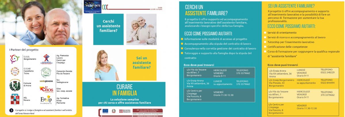 Il progetto "Curare in famiglia", presentato dal C.I.S.S. come capofila dell'Ambito Territoriale Sociale, Ufficio di Piano Area Nord, costituito dal Consorzio C.I.S.S. di Borgomanero, dal Consorzio C.I.S.AS. di Castelletto Ticino e dalla Convenzione di Arona, offre supporto ed accompagnamento all'inserimento lavorativo dell'assistente familiare, analizzando i bisogni specifici della famiglia. Inoltre offre all'aspirante assistente familiare la possibilità di partecipare ad un percorso di formazione per aumentare la propria professionalità e un supporto all'inserimento lavorativo.