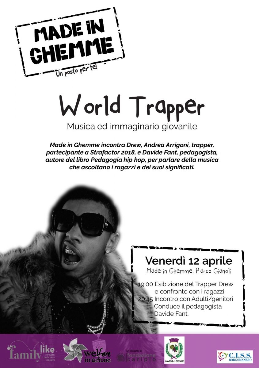 Venerdì 12 aprile 2019, Made in Ghemme incontra Drew, Andrea Arrigoni, trapper, partecipante a Strafactor 2018 e Davide Fant, pedagogista, autore del libro "Pedagogia hip hop" per parlare della musica che ascoltano i ragazzi e dei suoi significati.